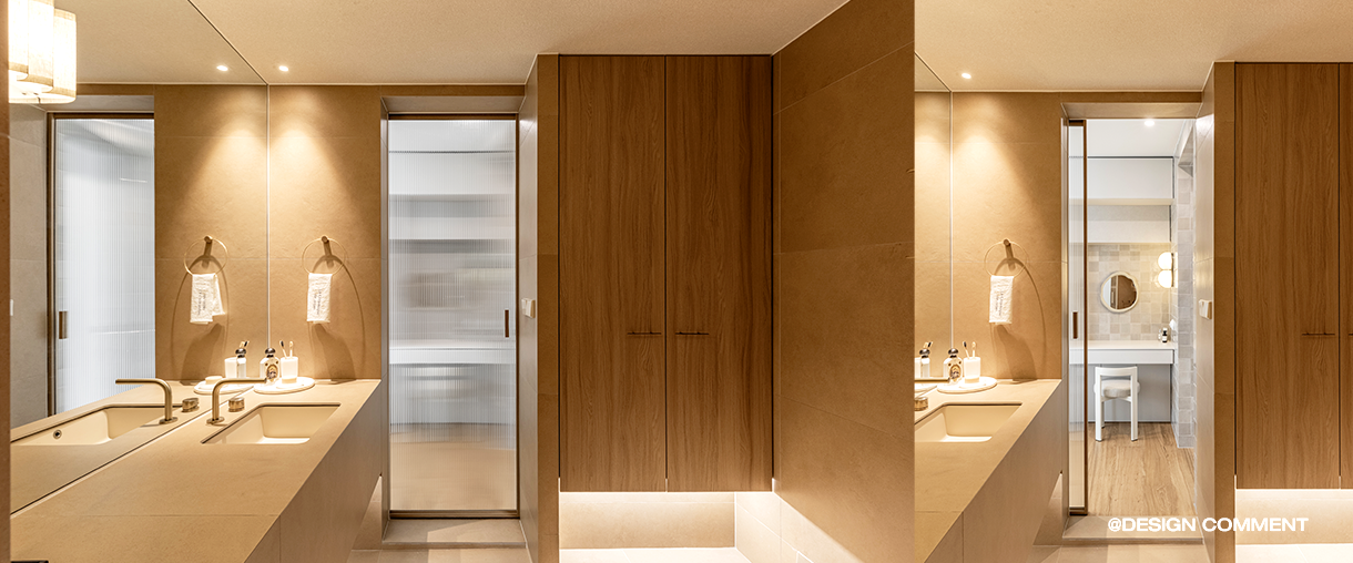 매트 스톤 상판과 넉넉한 수납 구성으로 실용성을 높였고, 반투명 도어를 적용해 프라이버시를 유지하면서 공간의 깊이를 더했습니다.