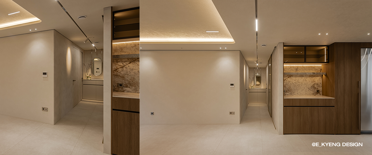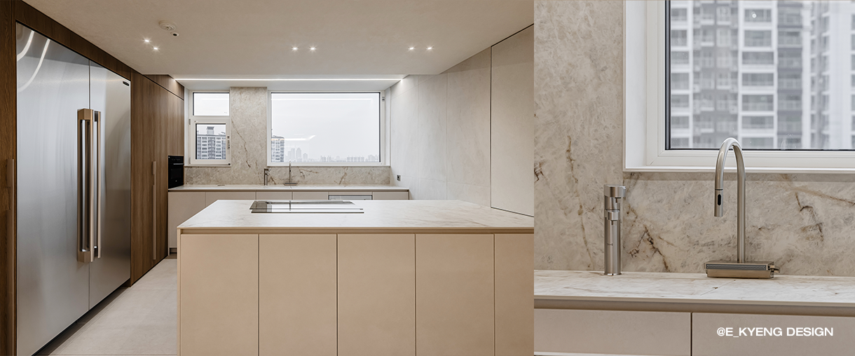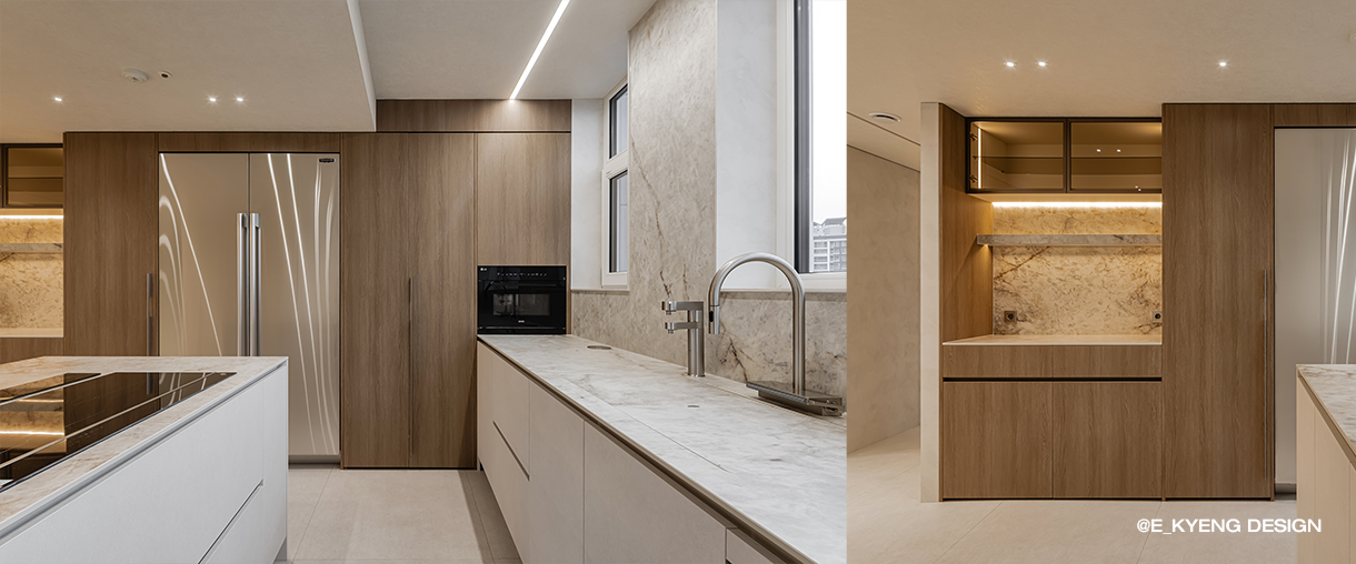 조명과 소재의 변화로 다양한 무드를 연출할 수 있는 주방입니다.