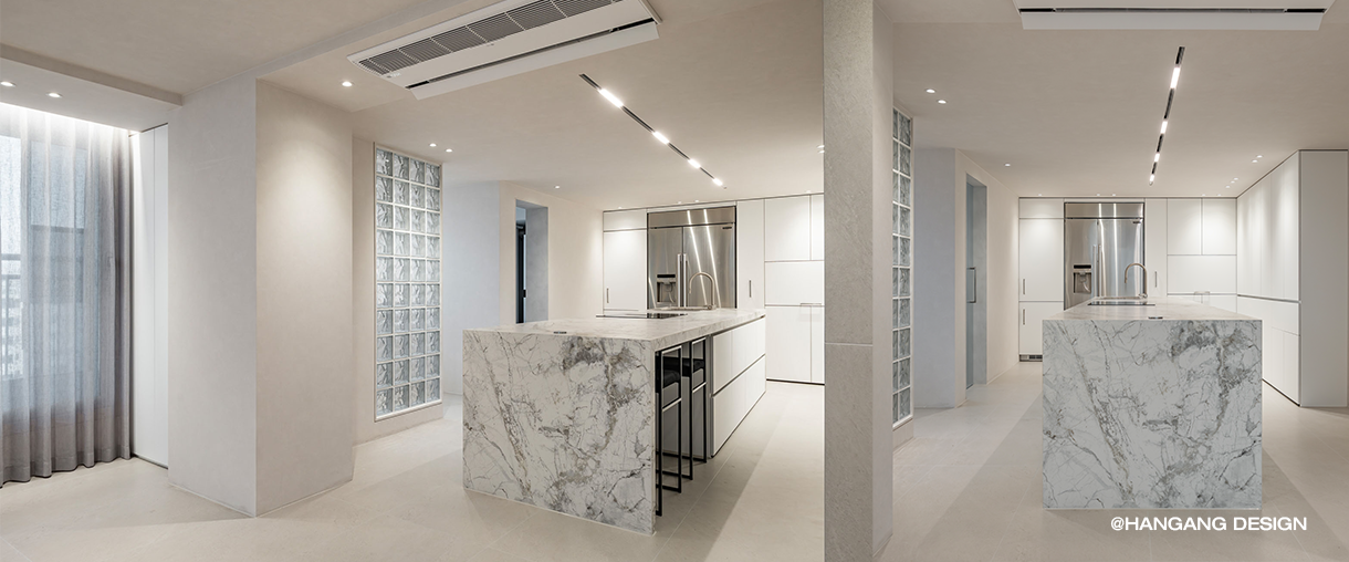 대리석의 자연스러운 패턴과 미니멀한 무광 화이트 도어가 조화를 이루는 주방입니다.
