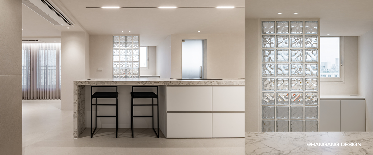 은은한 조명과 유리블록 포인트로 고급스러운 분위기를 완성했습니다.