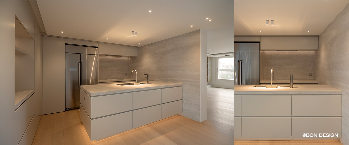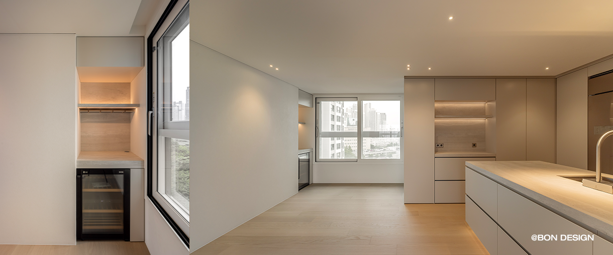 매립 손잡이와 간접조명을 활용해 군더더기 없는 정제된 인상을 주며, 내추럴 스톤 질감의 벽면이 공간의 깊이를 더합니다.