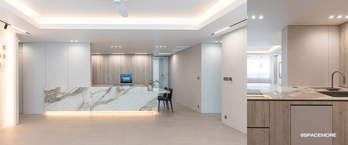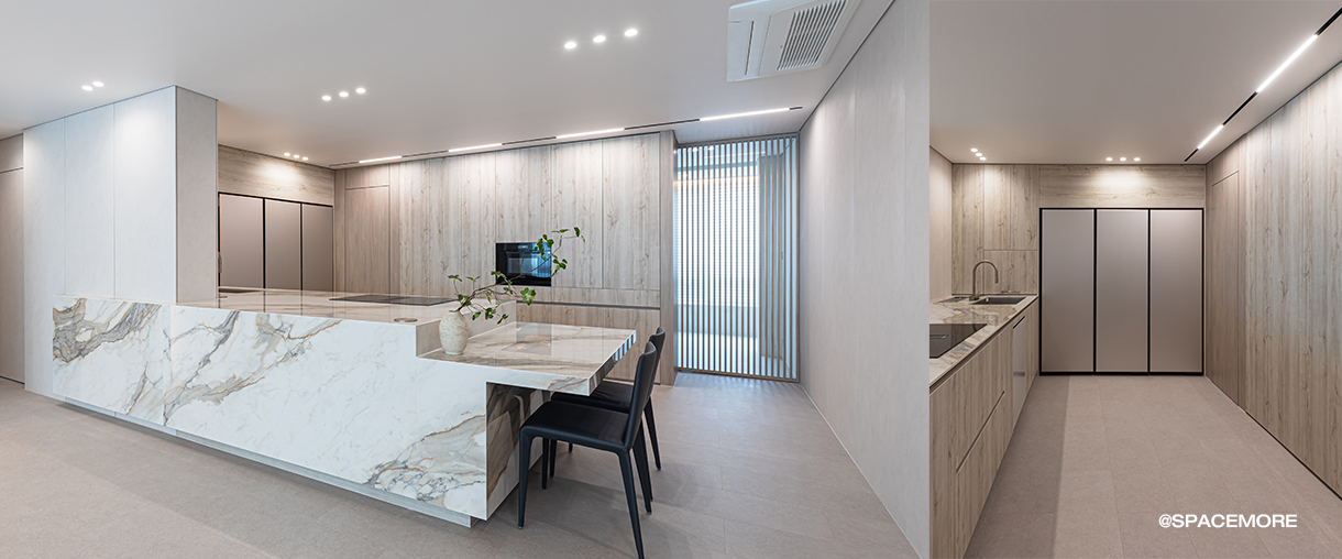화이트 마블과 라이트 우드 패턴이 조화를 이루는 밝고 세련된 주방입니다.