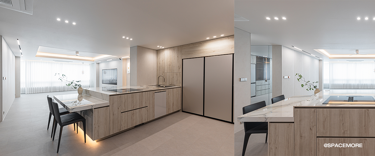 아일랜드와 다이닝이 자연스럽게 연결된 구조로, 공간 활용성과 디자인 완성도를 동시에 높였습니다.