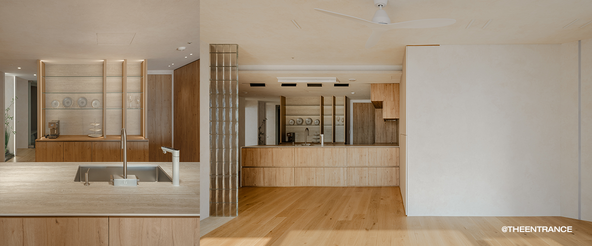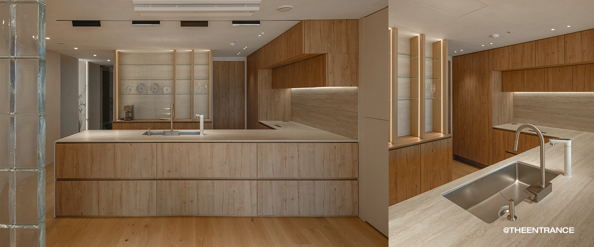 개방형 구조와 유리블록 파티션으로 거실과의 시각적 연결감을 높였으며, 아일랜드 중심으로 여유로운 동선을 구성했습니다.